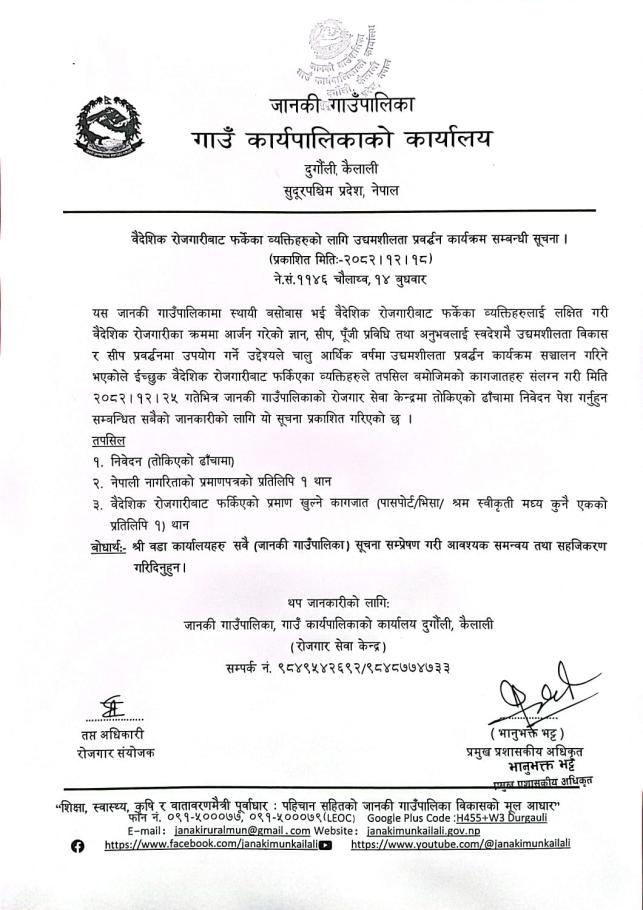 वैदेशिक रोजगारीबाट फर्केका व्यक्तिहरुको लागि उद्यमशीलता प्रवर्द्धन कार्यक्रम सम्बन्धी सूचना ।