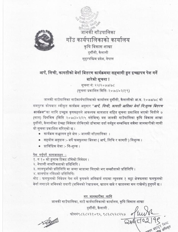 आँप, लिची, कागतीको बेर्ना वितरण कार्यक्रममा सहभागी हुन इच्छापत्र पेश गर्ने बारेको सूचना ।