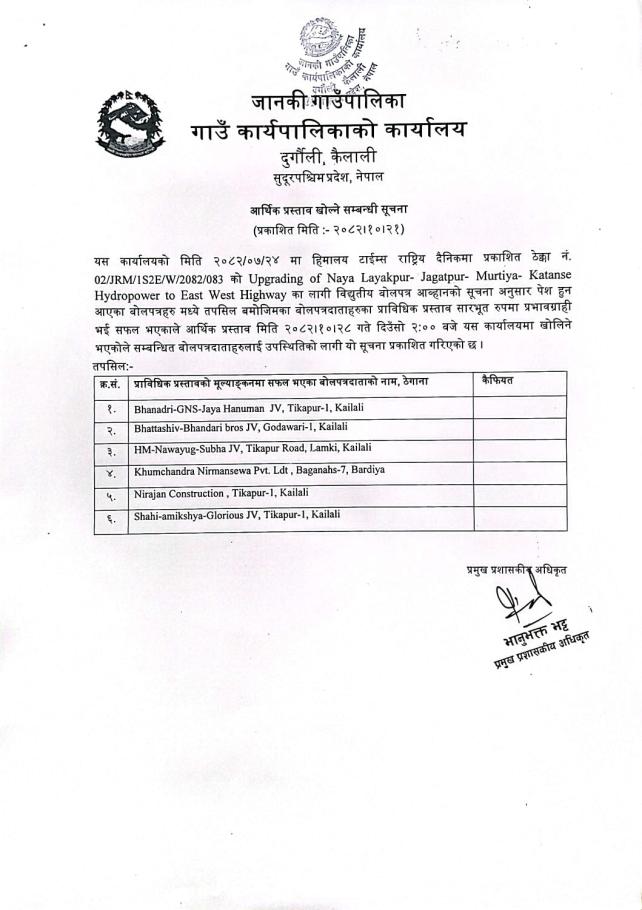आर्थिक प्रस्ताव खोल्ने सम्बन्धी सूचना । 01/JRM/1S2E/W/2082/083