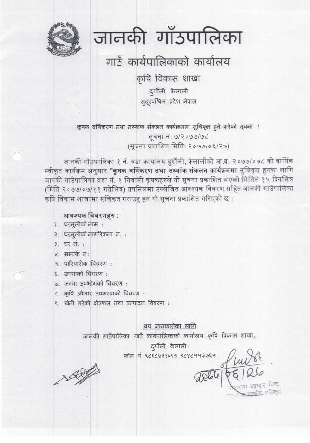 कृषक वर्गिकरण तथा तथ्यांक संकलन कार्यक्रममा सुचिकृत हुने बारेको सूचना ।
