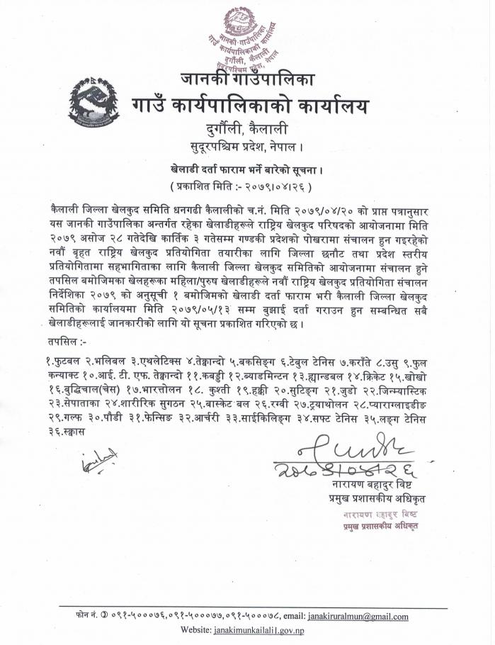 खेलाडी दर्ता फाराम भर्ने बारेको सूचना ।
