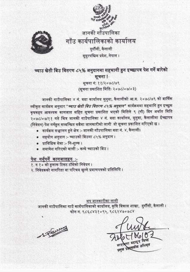 च्याउ खेती बिउ वितरण ८५% अनुदानमा सहभागी हुन इच्छापत्र पेश गर्ने बारेको सूचना ।