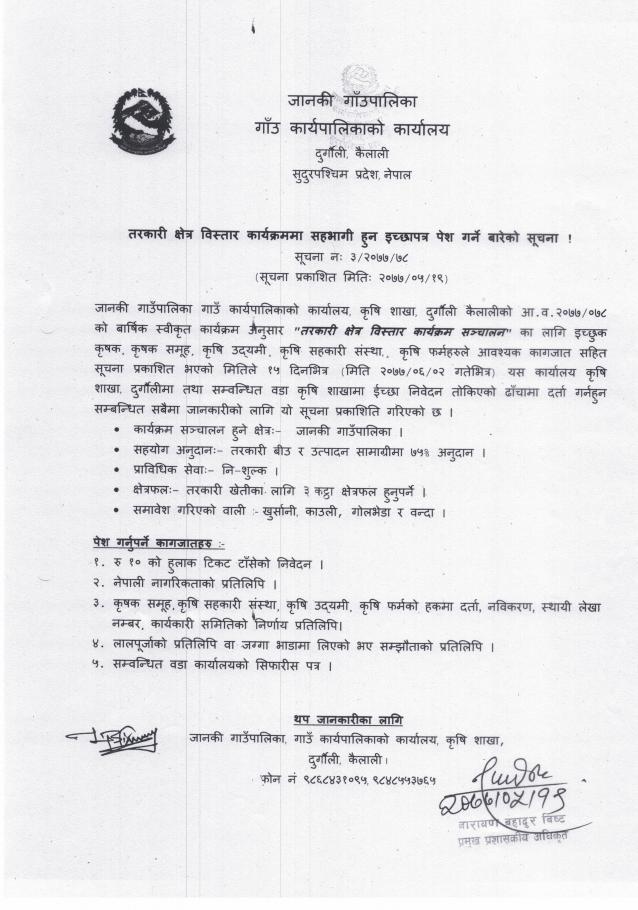 तरकारी क्षेत्र विस्तार कार्यक्रममा सहभागी हुन इच्छापत्र पेश गर्ने बारेको सूचना ।