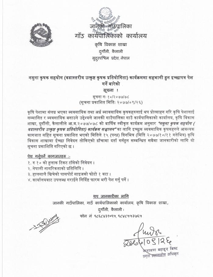 नमुना कृषक सहयोग ( वडास्तरीय उत्कृष्ट कृषक प्रतियोगिता) कार्यक्रमा सहभागी हुन इच्छापत्र पेश गर्ने बारेको सूचना l