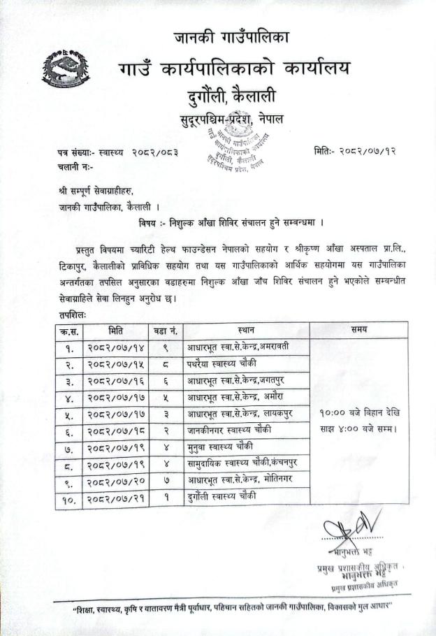 निशुल्क आँखा शिविर संचालन हुने सम्बन्धमा ।