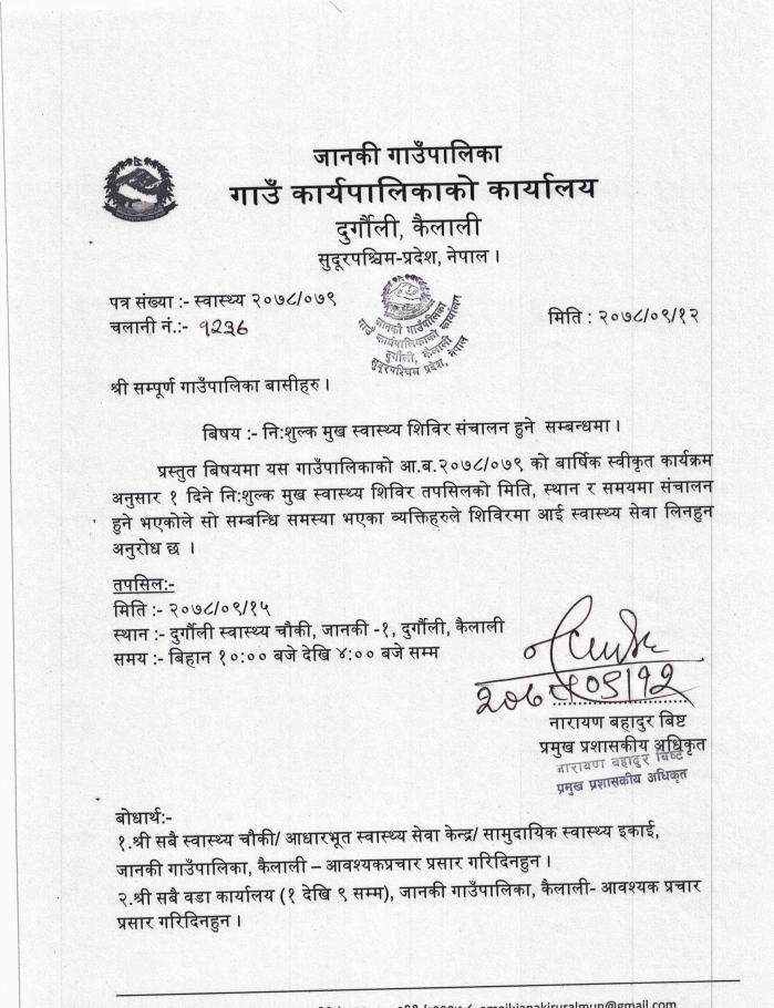 नि:शुल्क मुख स्वास्थ्य शिविर संचालन हुने सम्बन्धमा ।