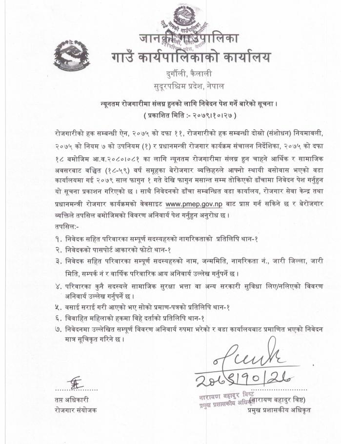 न्युनतम रोजगारीमा संलग्न हुनको लागि निवेदन पेश गर्ने बारेको सूचना ।