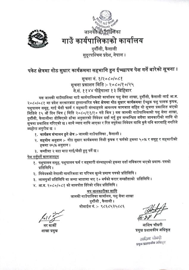 पकेट क्षेत्रमा गोठ सुधार कार्यक्रममा सहभागी हुन ईच्छापत्र पेश गर्ने बारेको सूचना ।