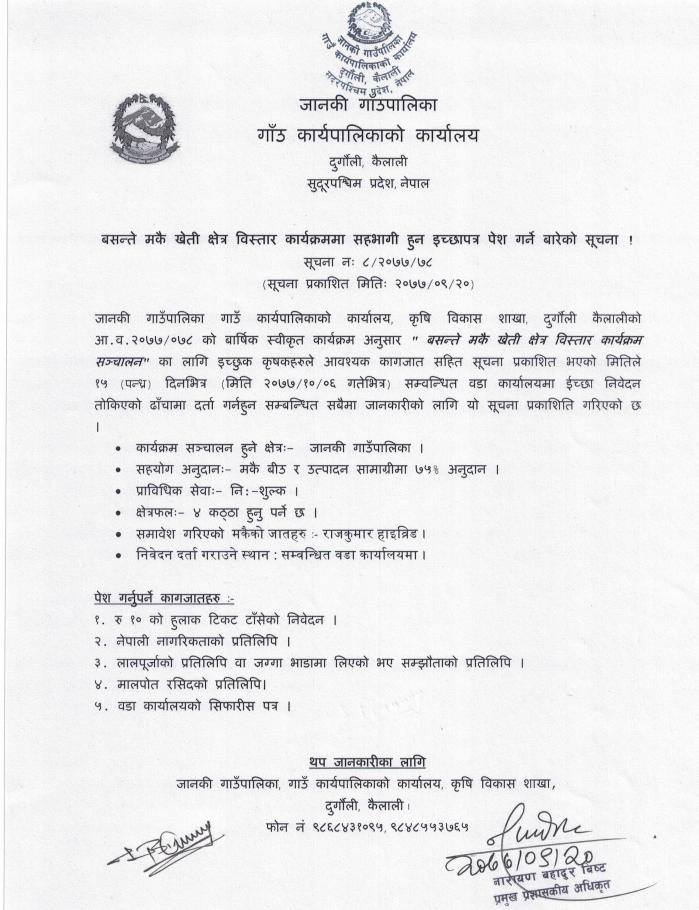 बसन्ते तरकारी र मकै खेती क्षेत्र विस्तार कार्यक्रममा सहभागी हुन इच्छापत्र पेश गर्ने बारेको सूचना l
