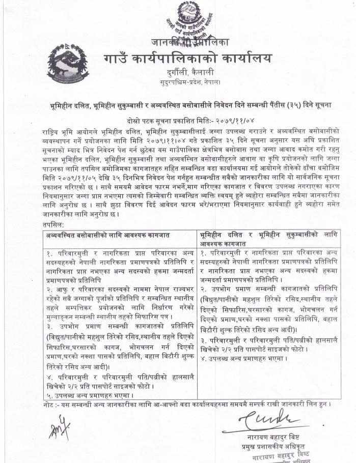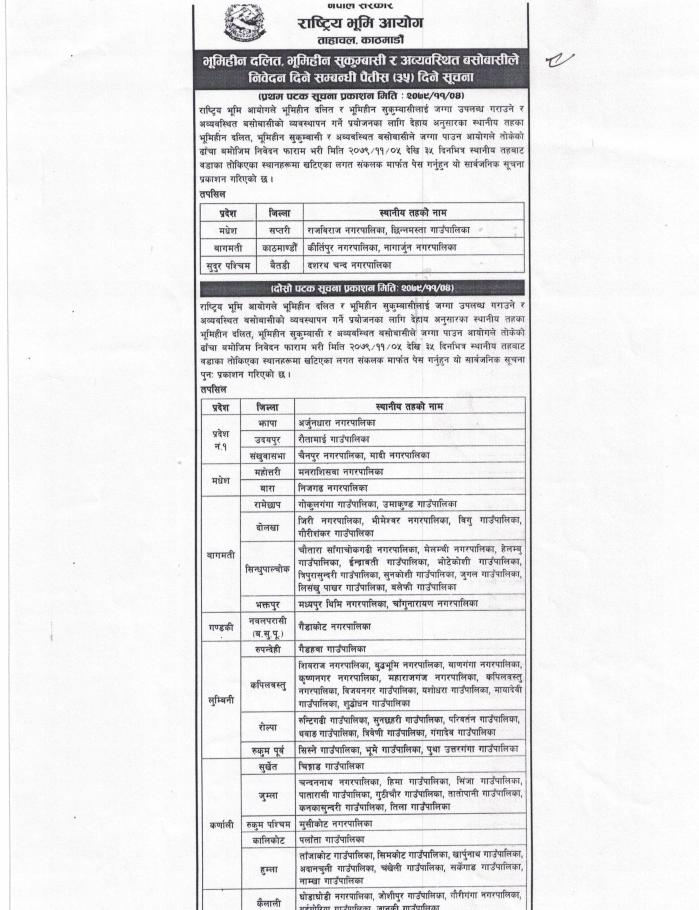 भूमिहीन दलित, भूमिहीन सुकुम्बासी र अव्यवस्थित बसोबासीले निवेदन दिने सम्बन्धी पैंतीस (३५) दिने सूचना ।