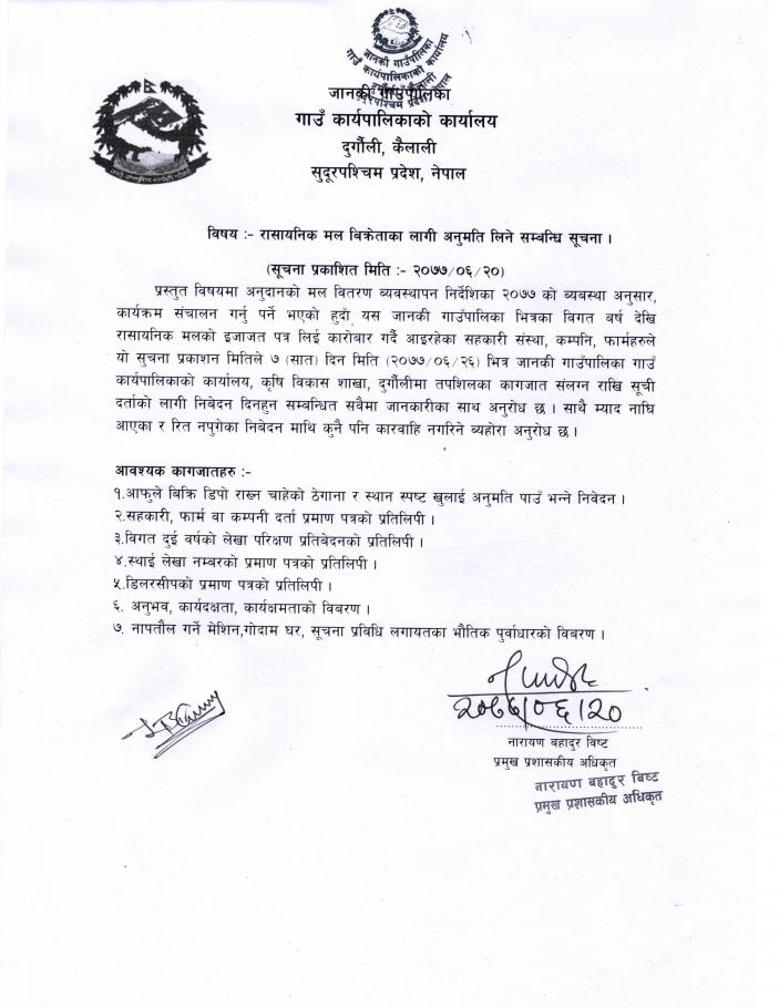 रासायनिक मल बिक्रेताका लागी अनुमति लिने सम्बन्धी सूचना ।