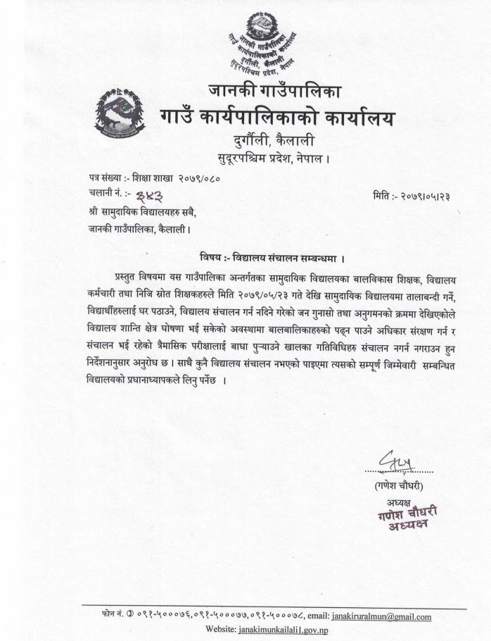 विद्यालय संचालन सम्बन्धमा ।