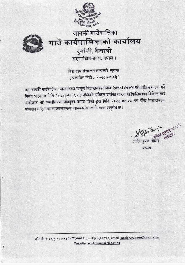 विद्यालय संचालन सम्बन्धी सूचना ।