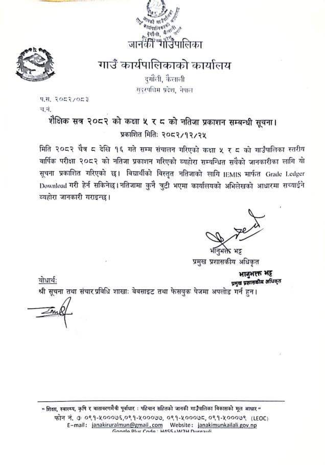 शैक्षिक सत्र २०८२ को कक्षा ५ र ८ को नतिजा प्रकाशन सम्बन्धी सूचना ।