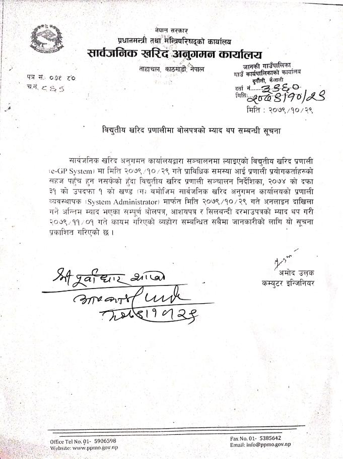 सार्वजनिक खरिद अनुगमन कार्यालय ताहाचल, काठमाडौँको विद्युतीय खरिद प्रणालीमा बोलपत्रको म्याद थप सम्बन्धी सूचना ।