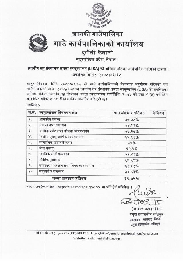 स्थानीय तह संस्थागत क्षमता स्वमूल्यांकन (LISA) को अन्तिम नतिजा सार्वजनिक गरिएको सूचना ।