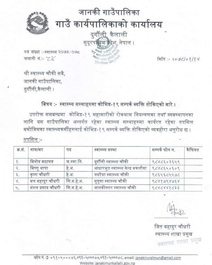स्वास्थ्य सस्थाहरुमा कोभिड-१९ सम्पर्क व्यक्ति तोकिएको बारे ।