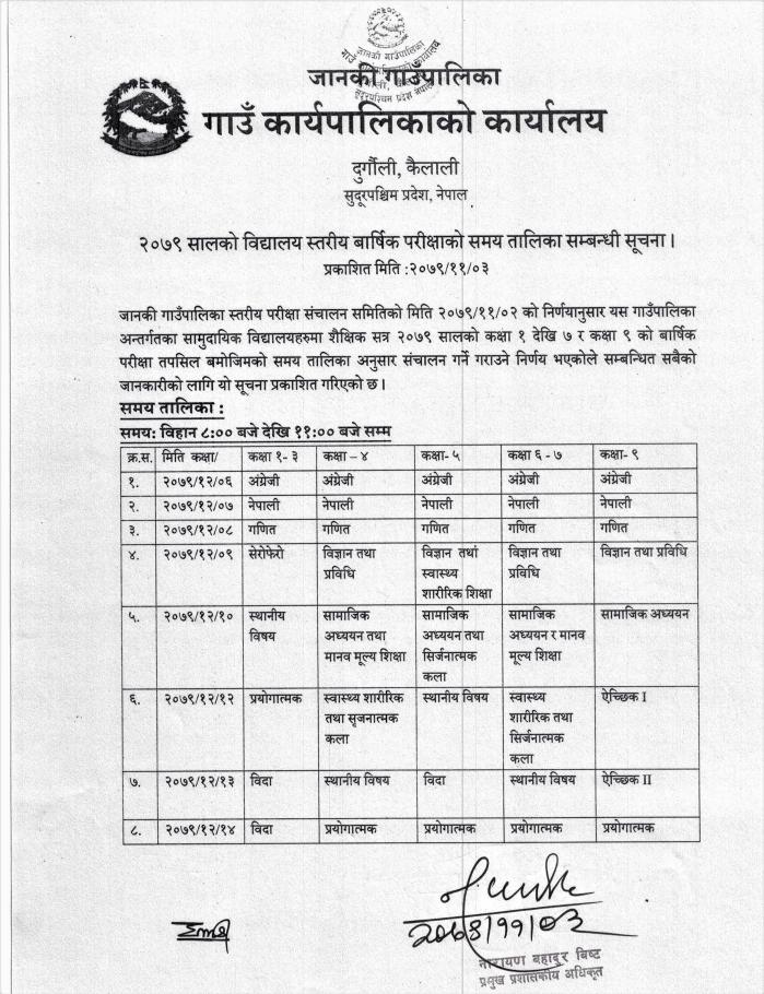 २०७९ सालको विद्यालय स्तरीय बार्षिक परिक्षाको समय तालिका सम्बन्धी सूचना ।